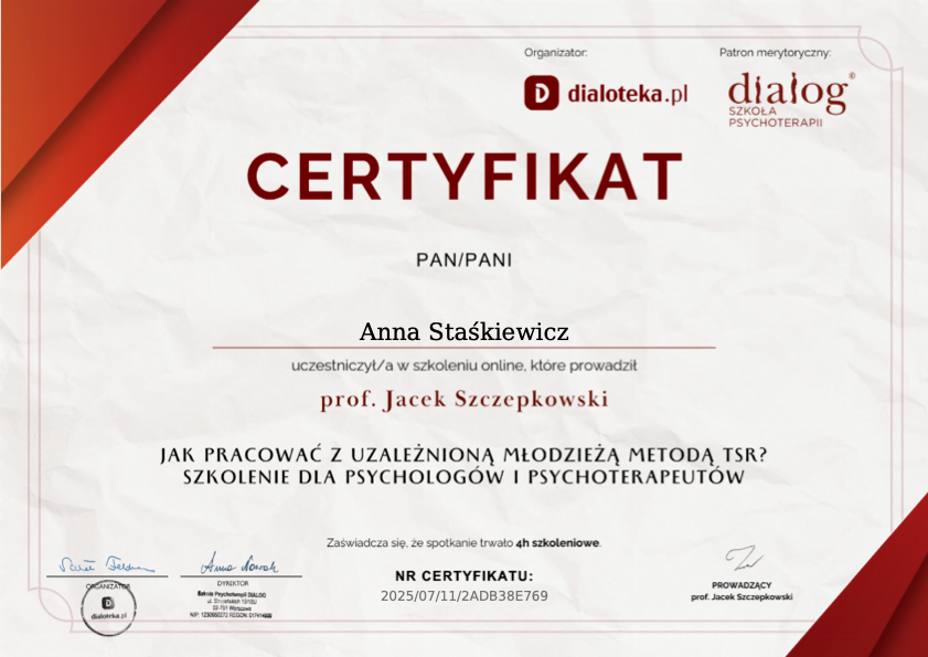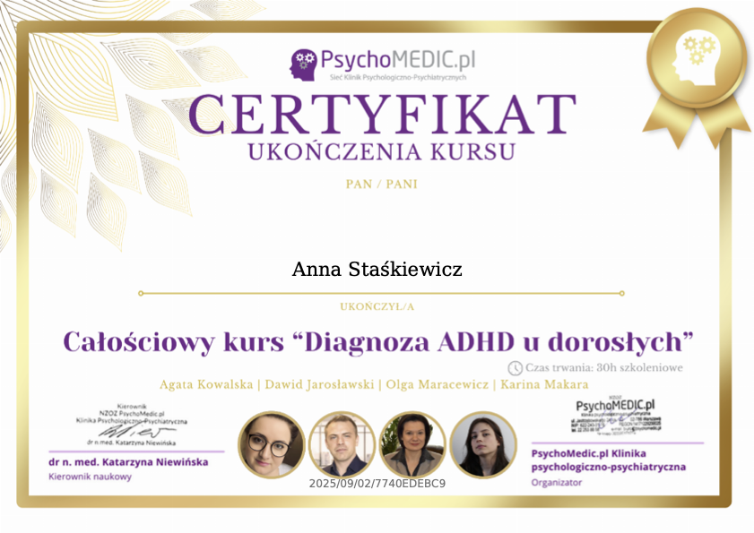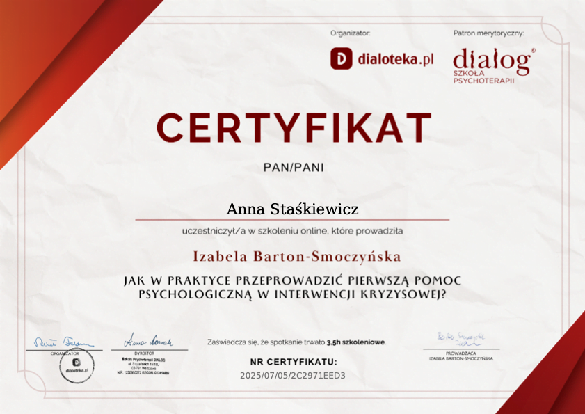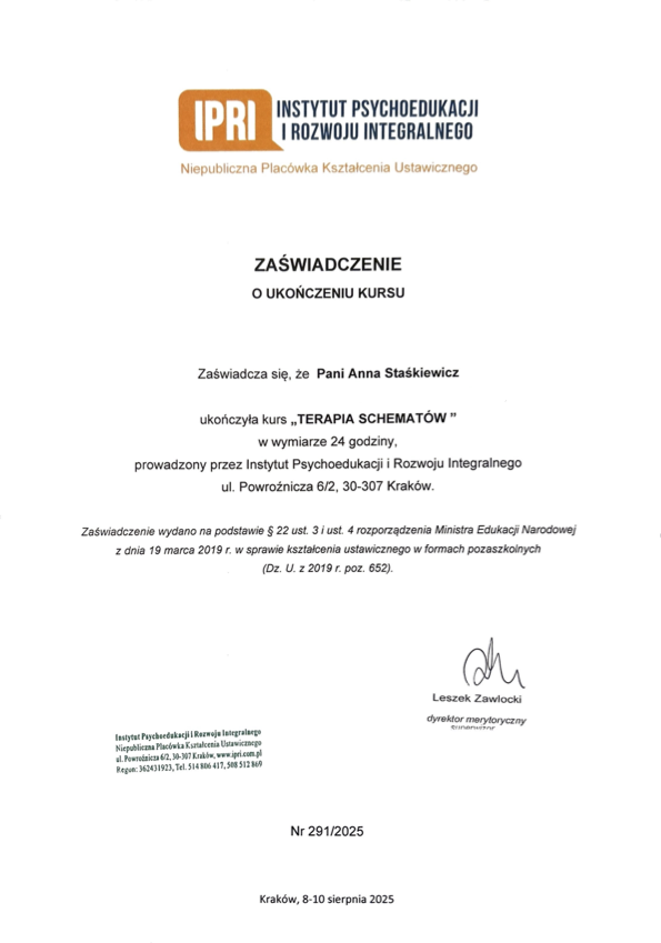 Swoje kwalifikacje poszerzam poprzez udział w licznych kursach i szkoleniach. Ukończyłam m. in. szkolenia z zakresu Terapii Schematów, Racjonalnej Terapii Zachowań (RTZ), Terapii Akceptacji i Zaangażowania (ACT), Terapii Skoncentrowanej na Rozwiązaniach (TSR) I stopnia oraz całościowej diagnozy ADHD u osób dorosłych. Regularnie uczestniczę także w konferencjach, webinarach i interwizjach, dbając o rozwój zawodowy i wysoką jakość swojej pracy.