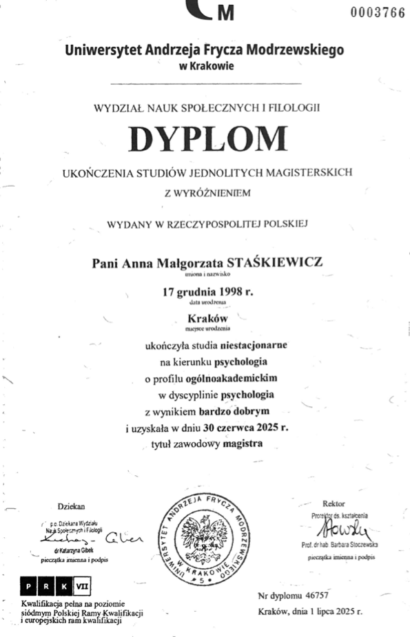 Jestem psychologiem, absolwentką jednolitych studiów magisterskich na Uniwersytecie Andrzeja Frycza - Modrzewskiego w Krakowie. Doświadczenie zawodowe zdobywałam m. in. w Wojewódzkim Szpitalu Psychiatrycznym im. prof. Tadeusza Bilikiewicza w Gdańsku, Szpitalu Klinicznym im. dr. Józefa Babińskiego w Krakowie oraz Szpitalu Specjalistycznym im. Ludwika Rydygiera w Krakowie. Na co dzień jestem związania z firmą Health Networks, gdzie udzielam konsultacji psychologicznych dla pracowników z różnych branż, wspomagając ich dobrostan psychiczny.